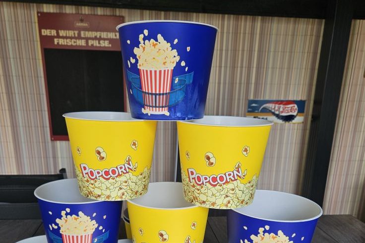 Zu unserer Popcornmaschine, bieten wir ab Sofort auch große Popcorneimer an. 12 Stück sind verfügbar, ideal für Heimpartys.